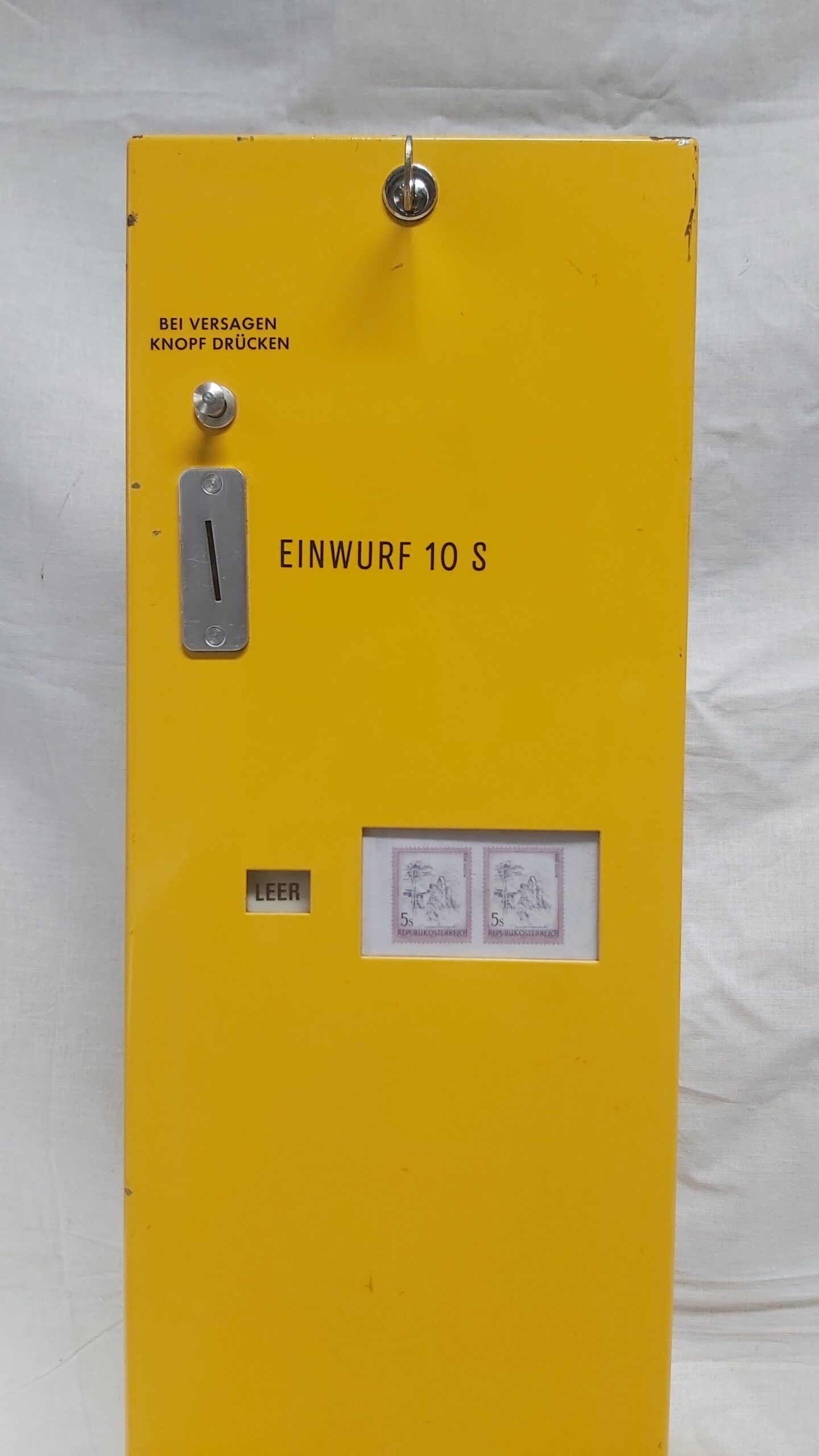 Briefmarkenautomat aus den 1980er Jahren voll funktionstüchtig mit 10 Schilling Einwurf vom Hersteller Theodor Braun in Wien.
