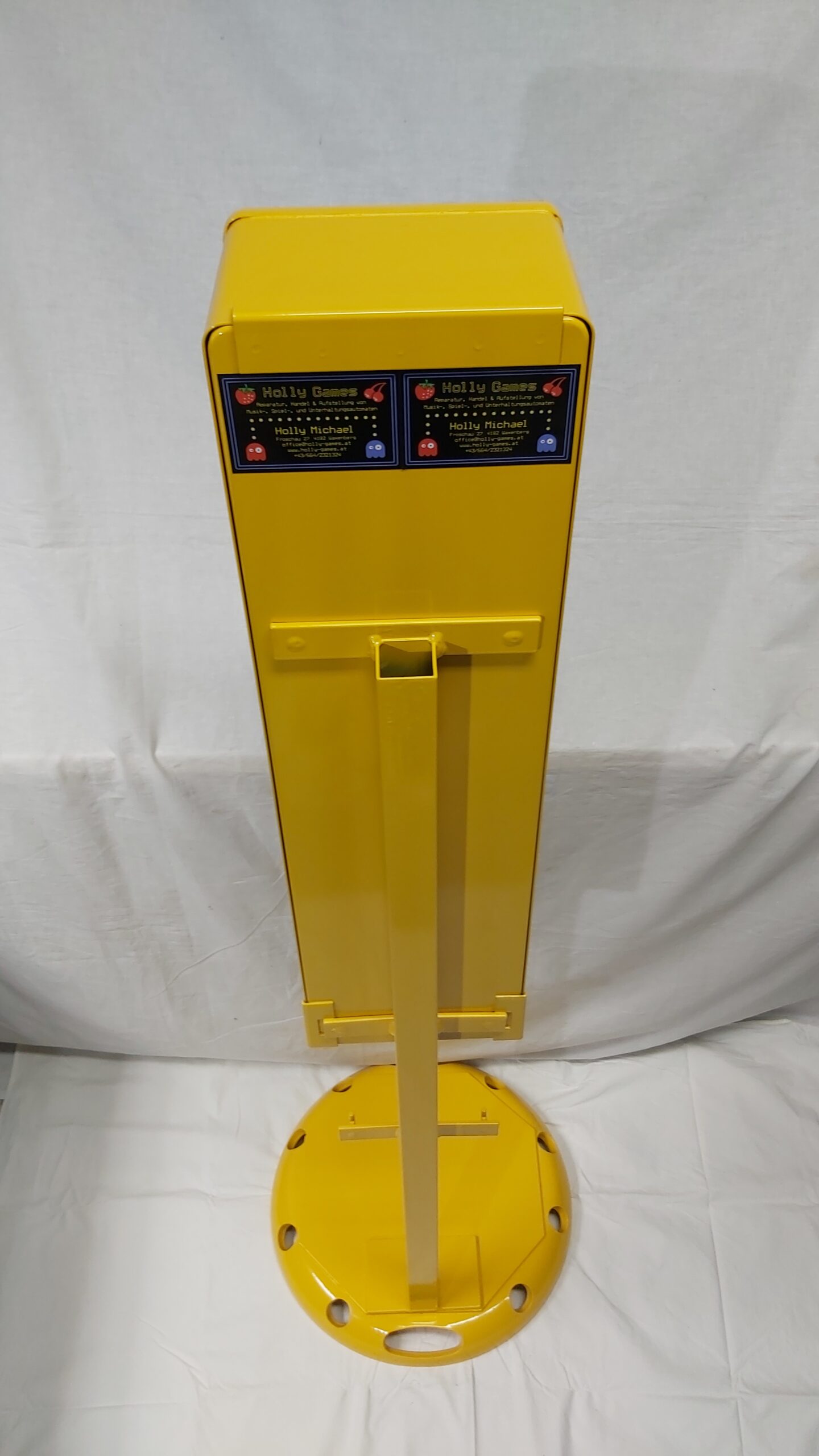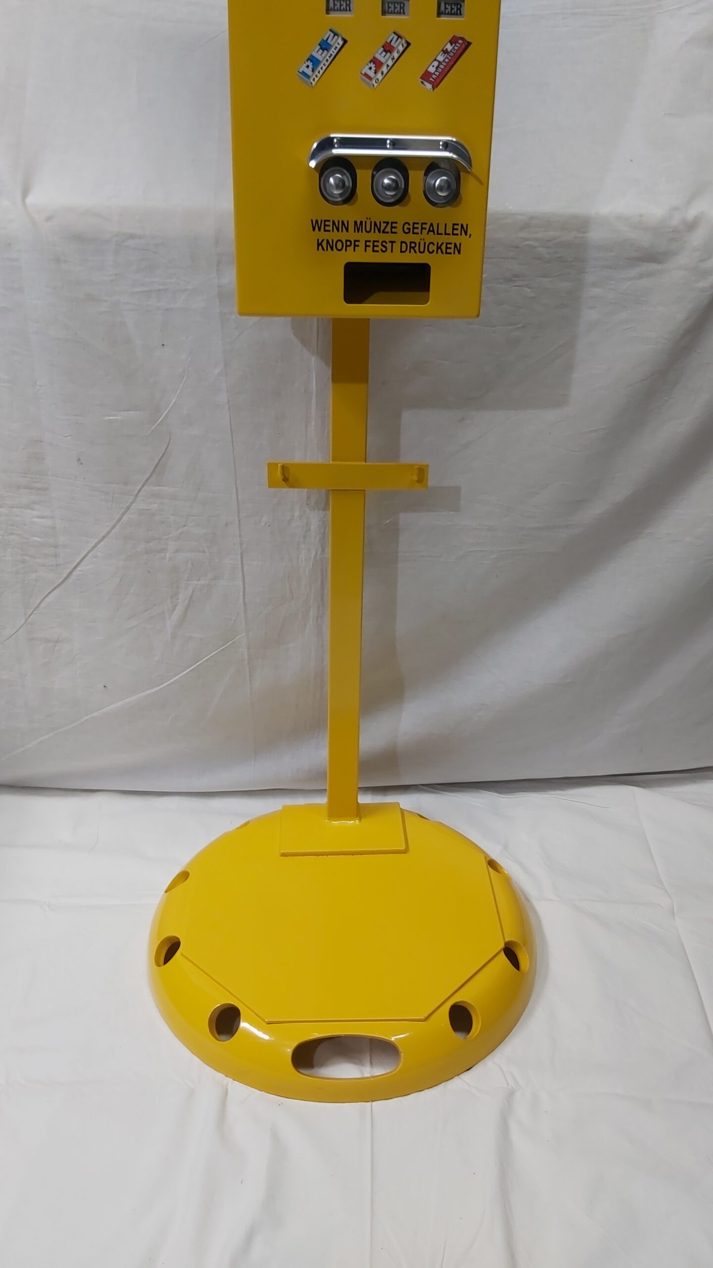 Der Automat inkl. dem Standfuß wurde sandgestrahlt, in gelb pulverbeschichtet und danach mit neuen Aufklebern beklebt.