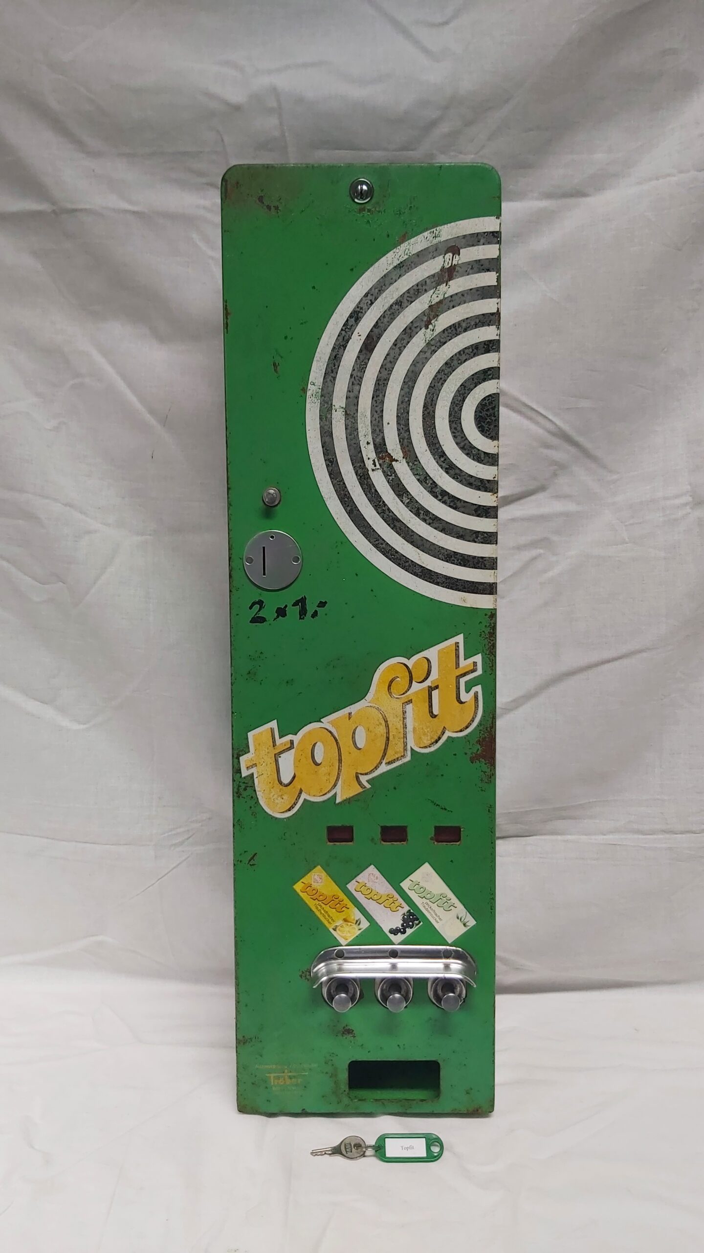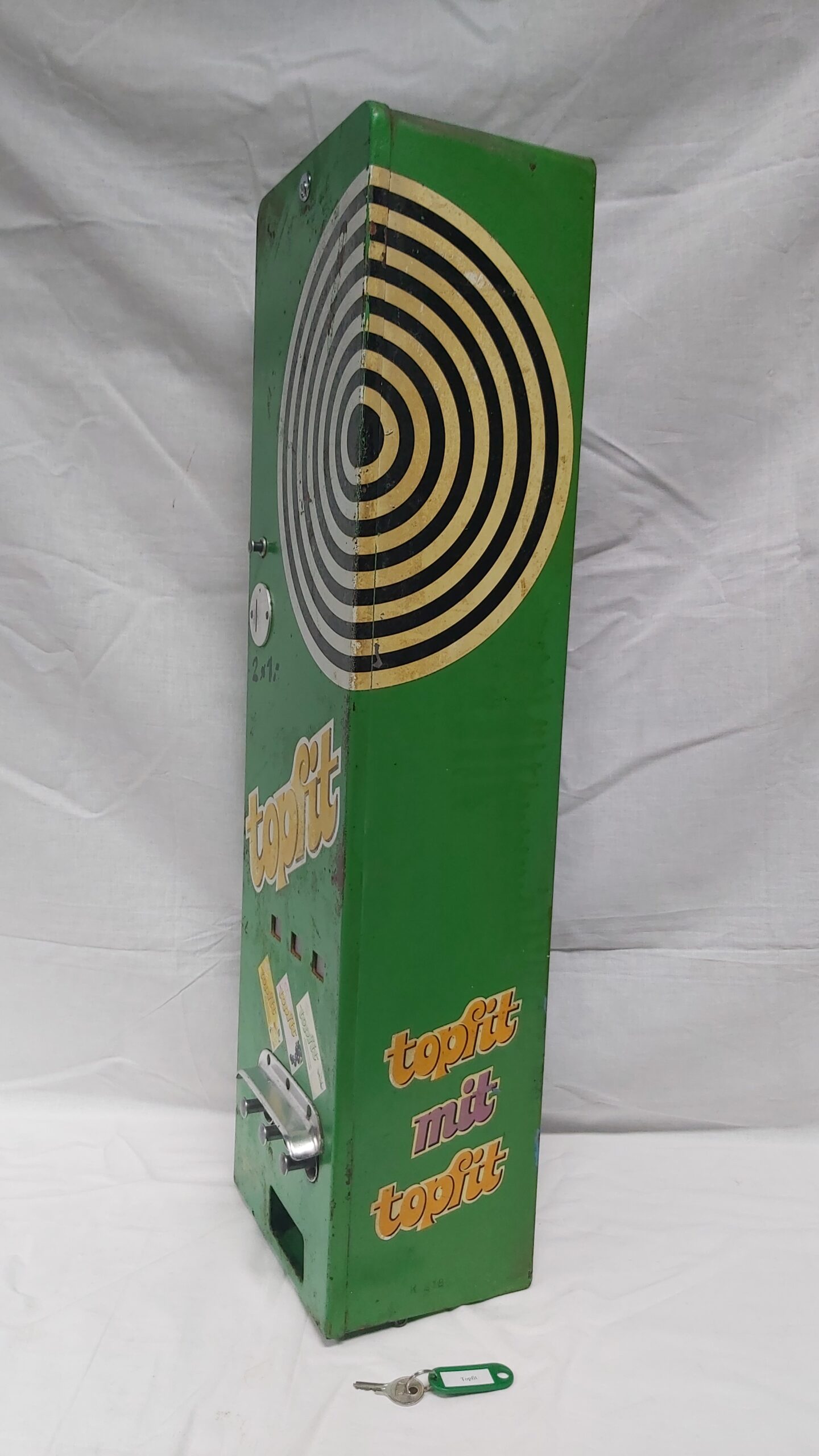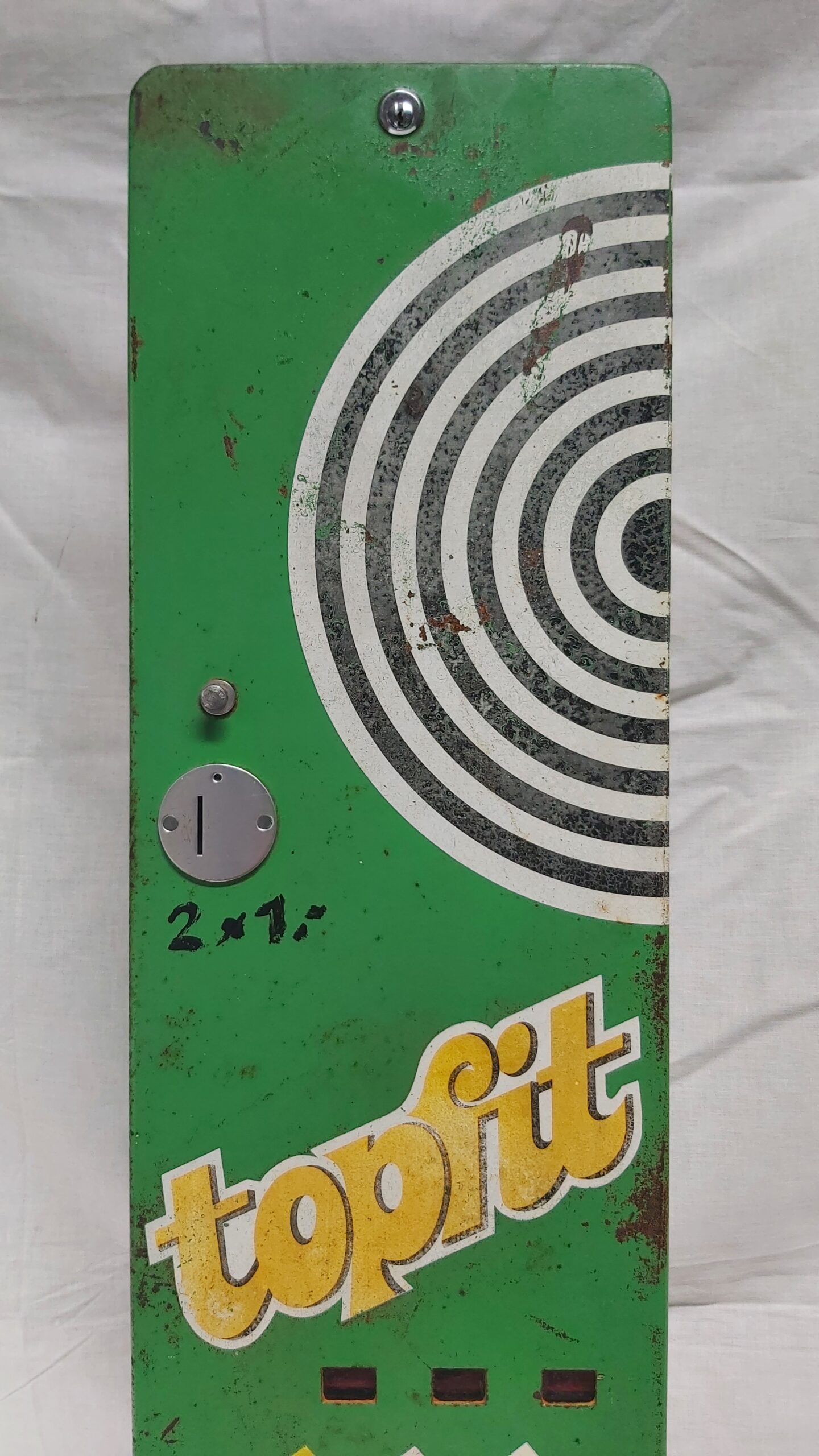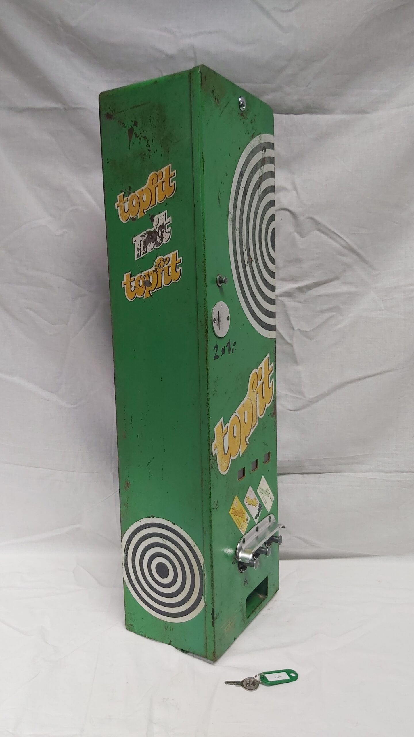 Warenautomat "TOPFIT" vom Hersteller Braun Automaten mit 2x1 Schilling Einwurf. Es sind 10 Stück 1 Schilling Münzen mit dabei. Der Automat wurde gereinigt, getestet und funktioniert.