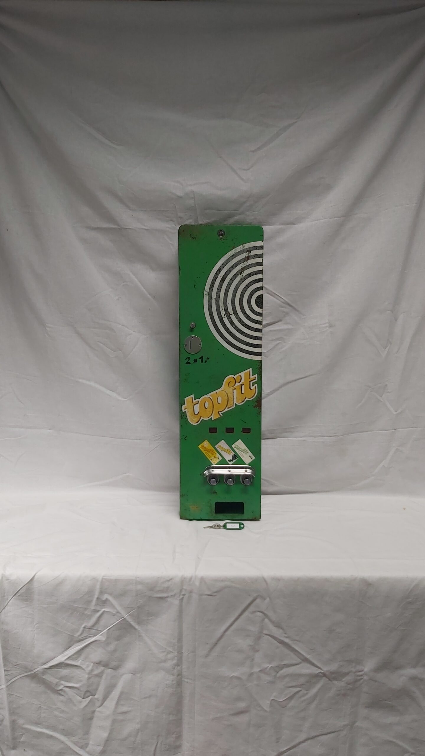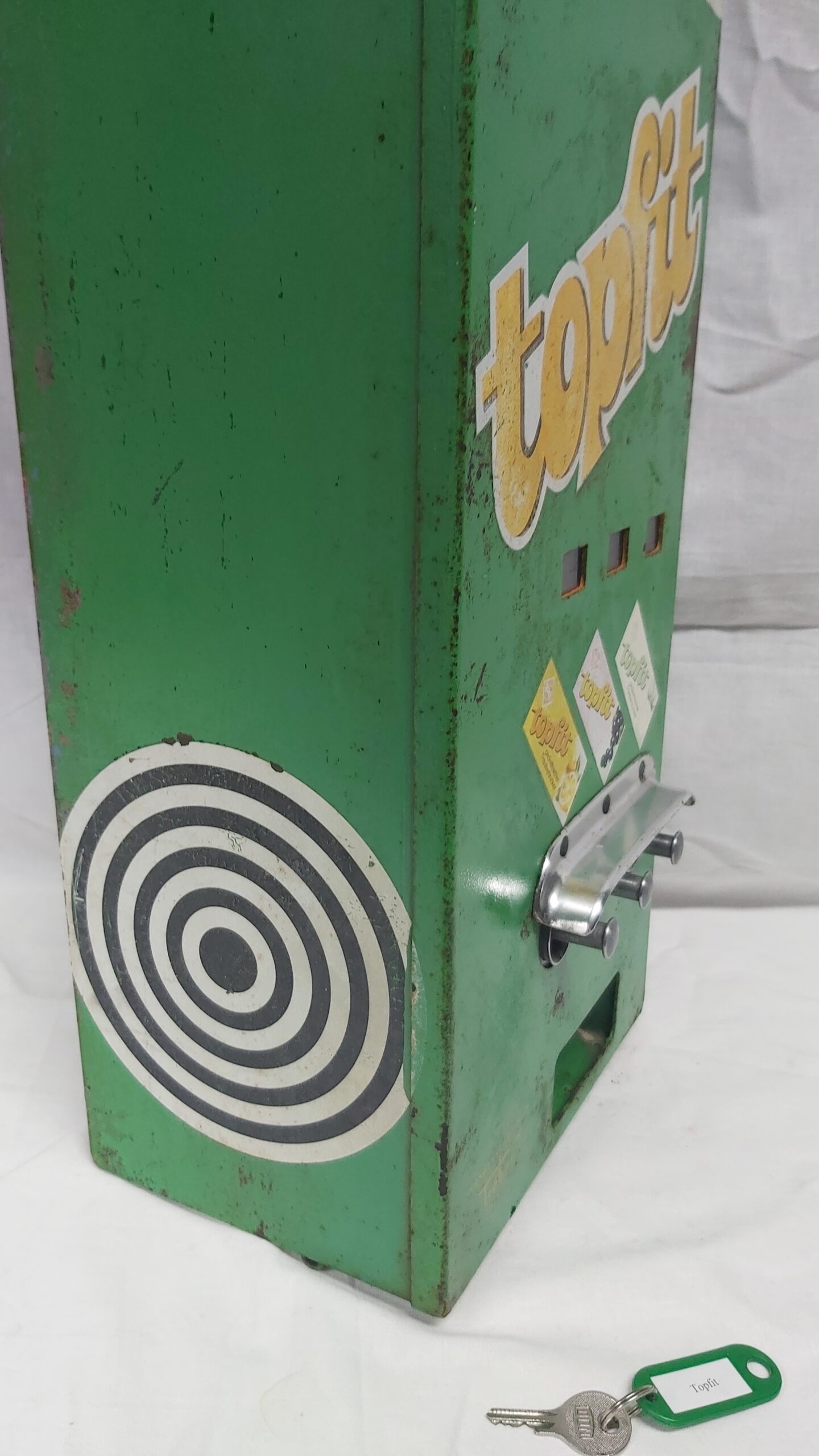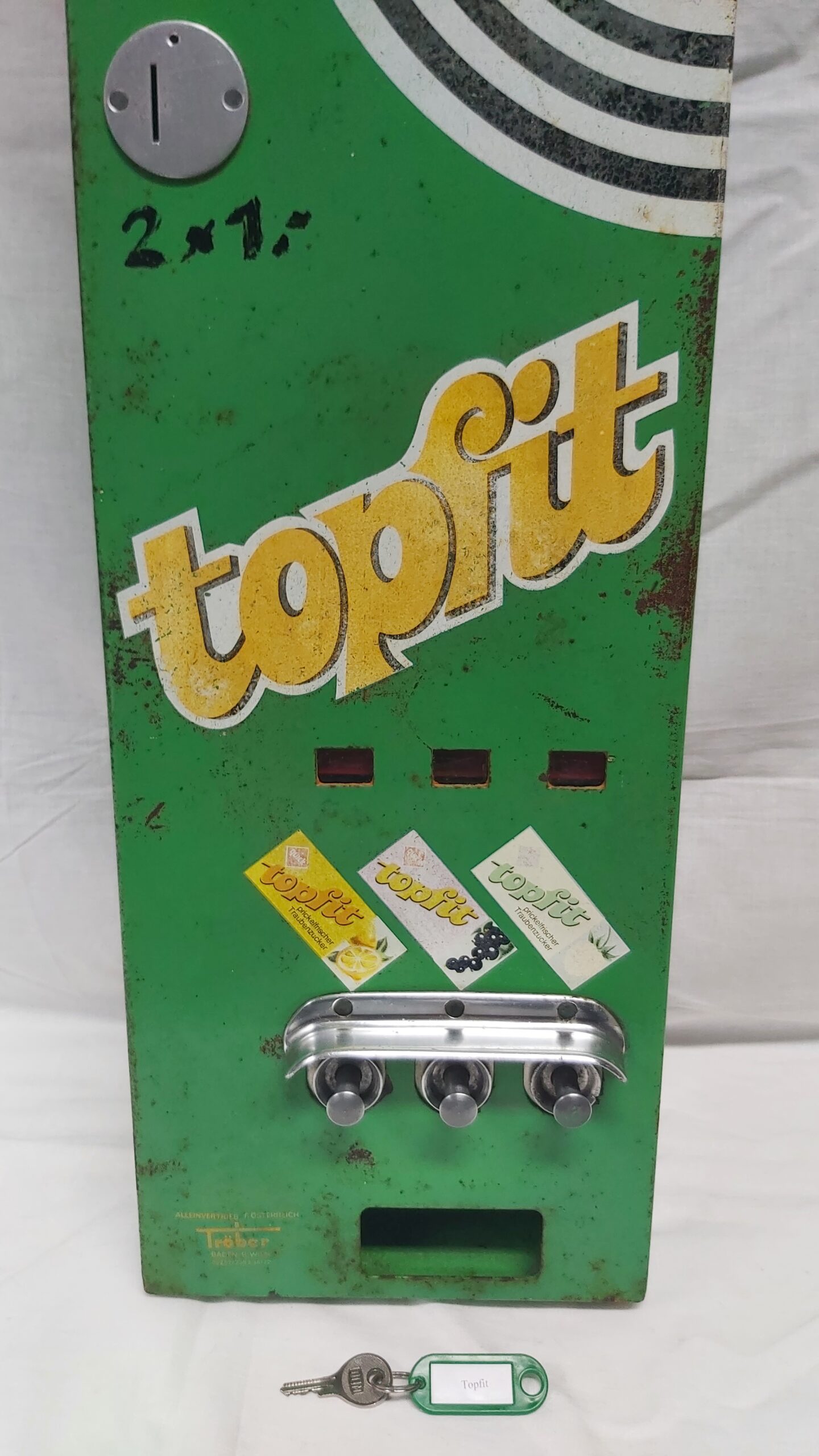 Warenautomat "TOPFIT" vom Hersteller Braun Automaten mit 2x1 Schilling Einwurf. Es sind 10 Stück 1 Schilling Münzen mit dabei. Der Automat wurde gereinigt, getestet und funktioniert.